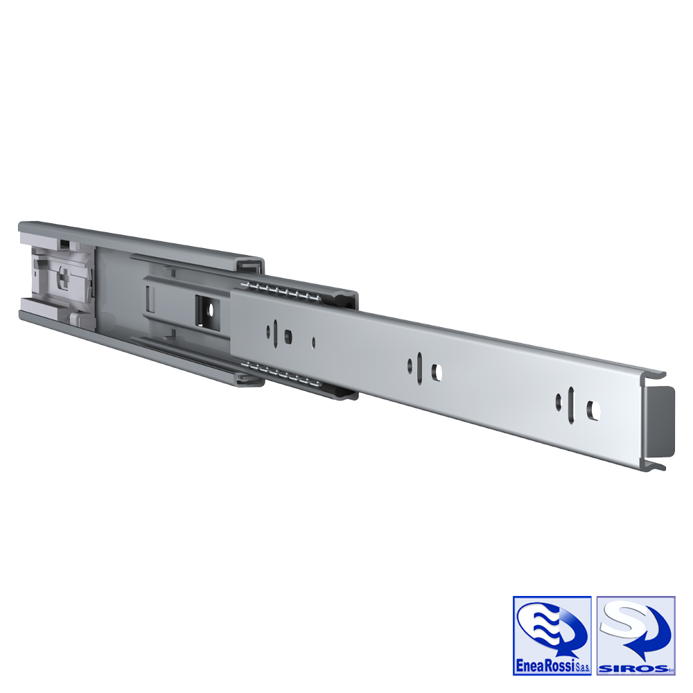 Guida telescopica a tre stadi con estensione totale e cuscinetti a sfera, dotata di sistema soft-close ammortizzato e meccanismo di sgancio a leva. Supporta carichi fino a 36 kg (79,4 lbs) ed è parte della nostra gamma di guide per carichi leggeri.