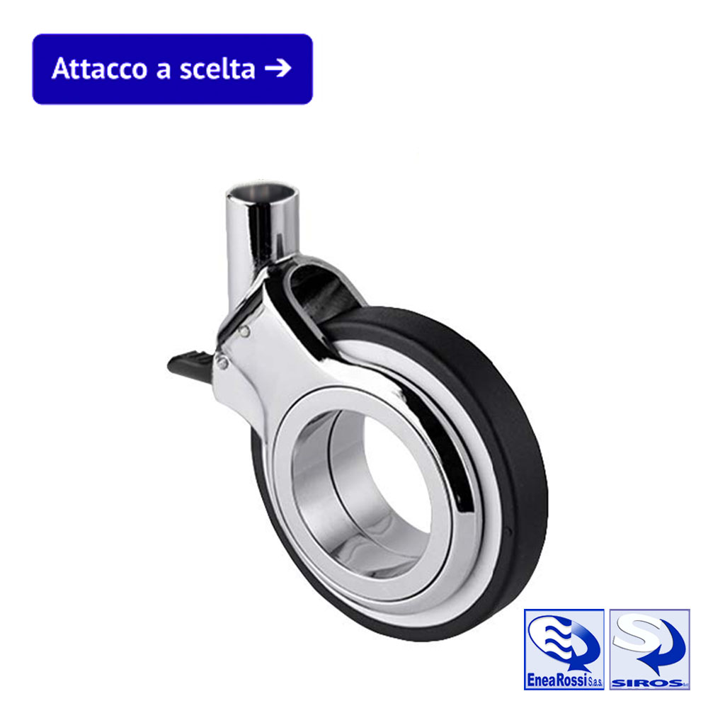 18L0049 – RUOTA – Olym – diam. 60MM – Piroettante con freno – Corpo Ruota cromato – battistr poliuretano nero – portata 60Kg Attacco a scelta
